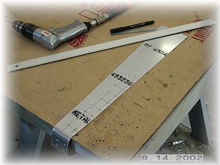 I think it is easier to drill the tip/counterweight skin to the skins over on the table. I extended the centerlines of the two rivet lines down the skin and laid out the rivet pattern. Be careful to square up the tip rib to the spar before drilling these holes. Once the tip is square to the spar, drill the two rows of holes down to the end of the tip rib.