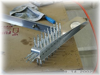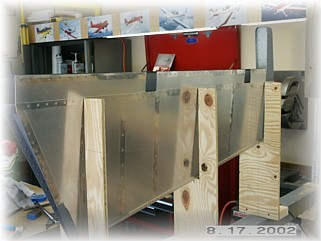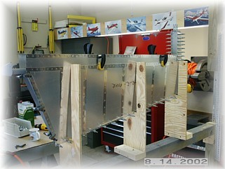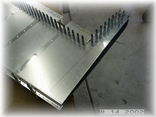 When you're done it should look something like this. Set the skeleton inside the skins and cleco it together. I set mine up in the jig and began riveting the skins starting in the center of the spar and working outward. The only problem I had was that I can't seem to find a way to set the last three rib rivets closest to the trailing edge. I chose to just use countersunk pop rivets and fill them. This is not quite as elegant as setting solid rivets, but once the whole airplane is finished and painted, it won't be noticeable.