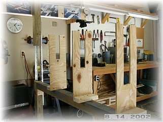 I built the jig and attached it to my crossbeam. You really don't need to make two end jigs. I just made jig #4. When it comes time to jig the left elevator with the trim tab spar, I will just screw a cross member to the #4 jig at the appropriate part. This way, I can set up and true the jigs just once and use them for both elevators. I clamped the skeleton to the two skins and drilled all the holes, starting in the center of the spar and working my way out to each end. Once that was done on both sides, I removed the elevator from the jig and brought it over to the table.