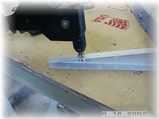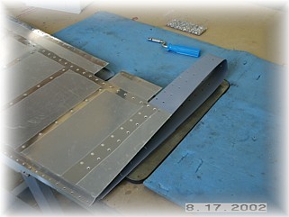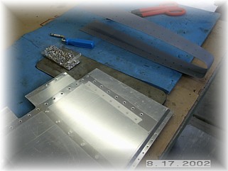 The first step in riveting the skins to the skeleton is to rivet the tip/counterweight skin to both elevator skins. This is done on the bench using your back rivet plate. Again, use easy pressure when using the back rivet plate because it is easy to overset these rivets. Remember to just set the inside row of rivets up to but not including the spar. The other row of rivets will be set with the tip rib in place.