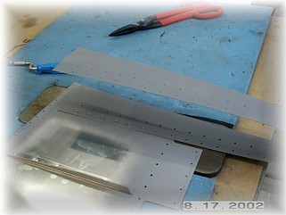 The first skin to attach to the skeleton is the tip/counterweight skin. I laid the rivet pattern out on the part over on the table and pre-drilled the holes in the skin first. This acts as a guide while I'm holding the skin on the part. Get your clamps out and drill the skin and the skeleton together. DO NOT drill any holes equal to or aft of the spar flange. These will be drilled in conjunction with the skin.