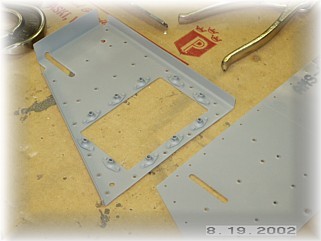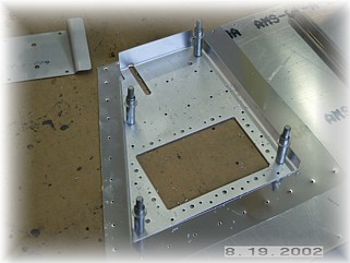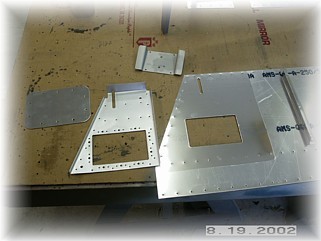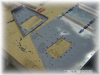 The first step in finishing up the left elevator skins for drilling and riveting is to attach the trim motor reinforcing bracket and cover. There are three parts to assemble. The opening in the skin and the bracket have been pre-cut and this is used to align the bracket in its proper position. I aligned the bracket opening with the skin opening and drilled all the mounting holes through the bracket and the skin. Be sure to NOT drill the holes that hold the nut plates around the edge of the opening. These holes do not go through the skin. Also, do not drill the two #12 holes either. These are alignment holes used to produce the part and are not used for anything. You should drill the screw holes though.