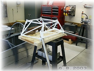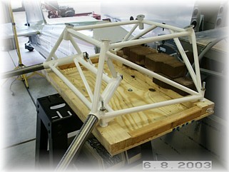 At first, I had the engine mount and the gear mounted to the fuselage, per the plans. I quickly decided that mounting the pants and fairings in this manner was NOT the optimal way of doing things. Since my work table was not sturdy enough for the weight of the mount and gear, I fabricated a quick table and mounted it to a metal table stand from my band saw. I used a couple of bricks to balance things out. By adjusting the legs, I was able to level the mount front to back and side to side. I really think this is a better way to get not only the wheel pants, but more importantly, the gear leg fairings mounted so that they are in-trail with the center line of the airplane. This is a very important alignment. You will have a lot of induced drag with the gear hanging out in the wind. If you want the optimum airspeed that your engine can deliver, you HAVE TO HAVE the gear leg fairings in perfect trail. That is very difficult to do with the approach outlined in the plans. The wheel pants aren't too bad, but the gear leg fairings are very difficult to get right. With the process outlined on this and the following pages, all I'll need to do is use some plumb bobs to get the mounting accurate. Of course, this approach assumes that the firewall is square with the centerline of the airplane.