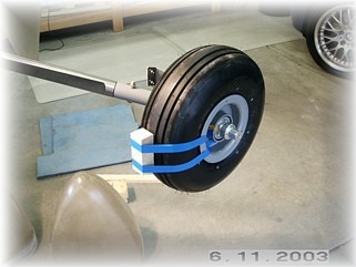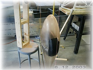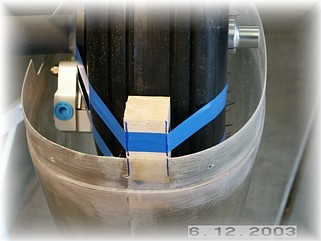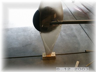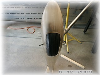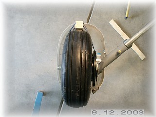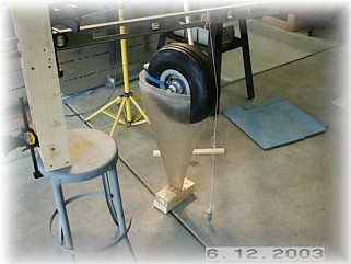 I then assembled the two halves around the tire. I supported the wheel pants with wood spacers on the floor so that the pants would stand in the right fore/aft position without me holding them. Next, I set the proper fore and aft tilt of the wheel pants. I dropped a plumb off the bottom of the tire and measured back 7 ½”. I put marks on the floor so I could re-check this measurement during the next step.