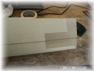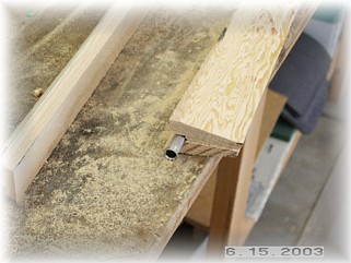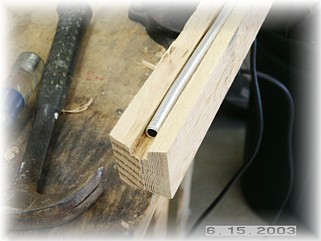After the glue dried, I made some initial cuts on my table saw. First, I cut the edge at an angle to allow the gear leg to settle into the stiffeners. I then cut a groove out down the inside center for a piece of 3/8" aluminum tube. I plan to run my brake line down the inside of this tube. I then beveled the stiffeners down their entire length so that the rear edge was about 1/2" thick.