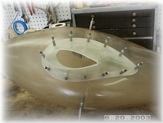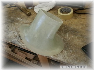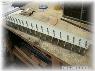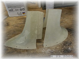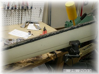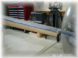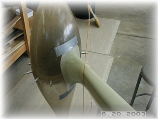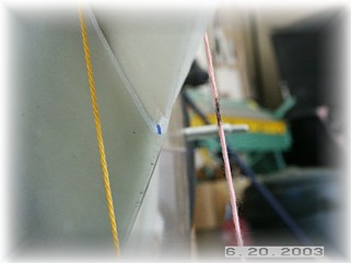After mixing up a healthy dose of proseal, I mounted the stiffeners to the leg and clamped them in the proper position. I used two plumb bobs to ensure that the stiffeners where in trail. After setting up overnight, I used a sander to smooth out the stiffeners and to round off the edges. I then glassed the stiffeners to the leg with two layers of fiberglass cloth.