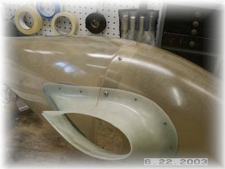 Over on the bench, I measured for and drilled mounting holes. I thought a bit about how to mount the lower intersection fairing. I couldn't mount it permanently to the wheel pants because I can't get to the upper mounting screws if I do. So the intersection fairing must be removable. I then looked at leaving it in one piece, but just couldn't find a way to get to the lower edge of the gear leg fairing to pull the hinge, so I decided that the intersection fairing would be split in two.