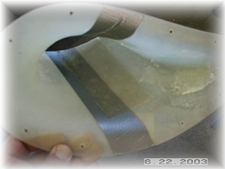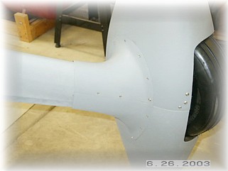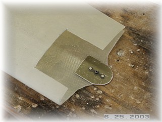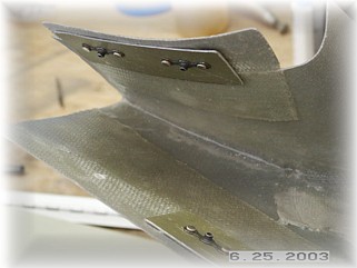 The final piece of the puzzle is to attach the hinge to the trailing edge of the gear leg fairing. I placed the hinge inside the fairing so that the trailing edges close around the hinge. When finished, you'll never know the hinge is there. I carefully clamped and drilled the holes into the hinge, making sure that the trailing edge was straight. I then got out some "Black Death", better known as Proseal, and riveted the hinge to the fairing.