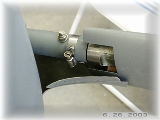 I left the hinge pin long and trimmed it so it bent up to and across the gear leg. I then secured it with a worm clamp. All that is left to do is to run the brake line down through the support tube in the back of the gear leg and around the axle to the brake cylinder. That's on the next page. |