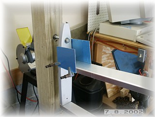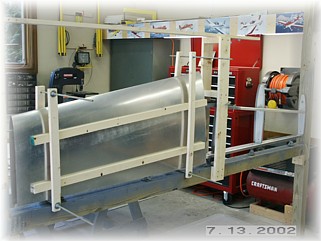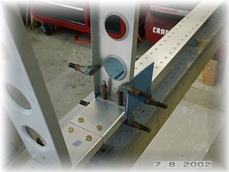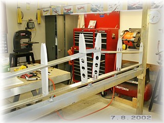 With the skeleton drilled together, it can be removed from the jig and riveted together. After cleaning the holes up, I riveted all the ribs together EXCEPT the two inner-most ribs. I left these clecoed to the spars so that they could be removed for skin riveting. If you permanently rivet these ribs now, you will have to put pop rivets in the center leading edge rib because you'll not have any way to get a bucking bar in there. By leaving the inside ribs unattached, you can reach your skinny arm (or the skinny arm of your assistant) in there to buck solid rivets. I mounted the skeleton back into the jig and attached the same center post that I used on the vertical stabilizer. The center post is used to further steady the skeleton prior to skinning and it also gives you a way to adjust the vertical alignment of the ribs so the assembly can be clamped into final position. It was at this point that I discovered a big OOPS. While trial fitting the skin, I found out that my jig was not wide enough. I could not place the skin on the skeleton in the proper position without the upright post getting in the way of the skin overhanging the tip rib. This is the same jig that I used to build my RV-7A empennage. Well, the F1 Rocket skins hang out over the edge of the end rib about an inch further than the RVs. So my jig was about two inches too narrow. After cursing for about 15 minutes, I came up with a viable solution short of disassembling the entire jig. However, I will be able to only skin one side of the horizontal stabilizer at a time. It is preferable to do both at the same time but I think I can get by without screwing things up too badly. I wouldn't recommend building yours this way, but this is my 5th horizontal stabilizer so I know enough to be dangerous.