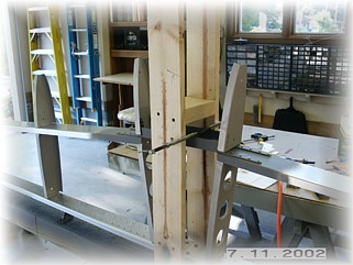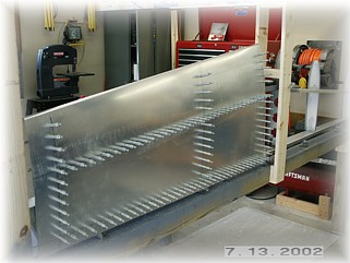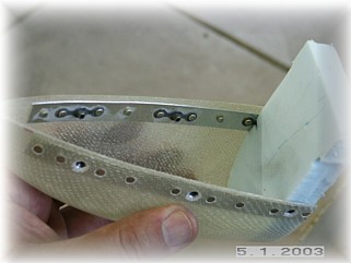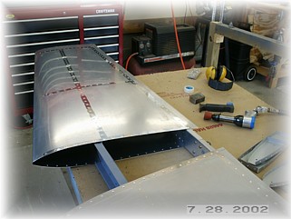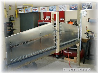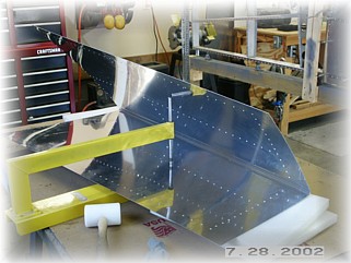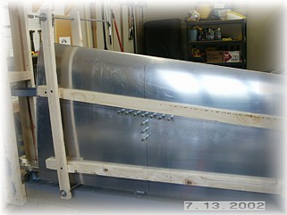 The skin is drilled to the skeleton starting in the center and working downward and outward. Again, I put a cleco in every hole to try and get the skin as tight as I can. I drilled around the 1X2 clamps where I had to until I had as many holes drilled as I could. I then removed the clamps the drilled the remaining holes. It is important when drilling the holes along the rear spar to remember two things. One, cheat a little toward the rear edge of the spar. If you drill the holes in the exact center of the web, you will have difficulty bucking the rivets because the reinforcing plate rivets on the aft face of the rear spar will get in the way. Second, determine your rivet pattern by starting in and around the hinge parts. You don't want to put a rivet in a location that you can't buck because the hinge is in the way. You can put a rivet on either side of the hinges and the spacing will work out okay.