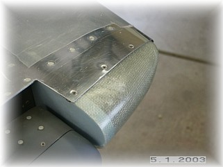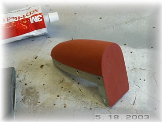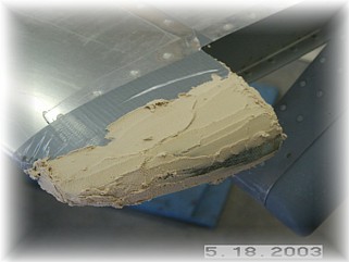 After trimming off the excess glass, I reinstalled the tip and protected the aluminum with some duct tape. I then covered the tip with a dry mixture of microballons in order to get a flush fit with the skin. Once that dried, I sanded the tip smooth and removed it so that I could fill all the pin holes with spot putty.