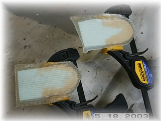 After a trial fit, I glassed the end ribs with two layers of cloth. I used a little microballon mixture around the edge so that I would get a good fit.
