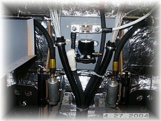 The first part of the electrical system is to bring the wires up from the center tunnel. This is where I chose to mount my starter solenoid. The device above it is a 60 AMP fuse for the primary alternator. I brought the two wire bundles up and clamped them to the bracket that I had fabricated. This now gets all the wires in behind the panel.