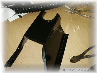 Next, I had to accommodate the fresh air line that's in the center panel. I took my cover and cut a round hole in it so that the hose would fit into it. This allowed me to bring the hose up and forward of the starter solenoid. From here, I'll route it up through the mounting panels and over to the side to the NACA vent.