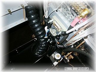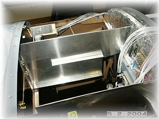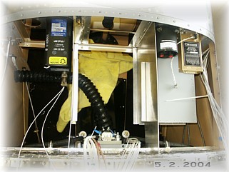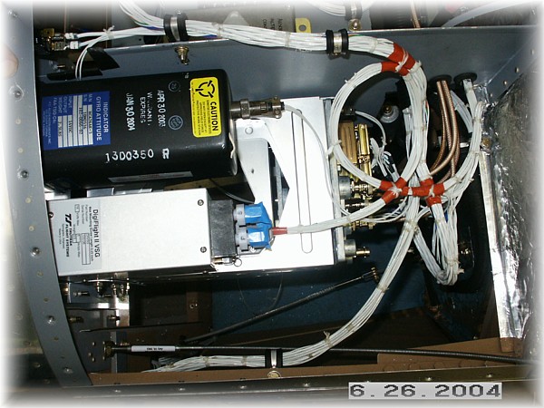 This is a picture of the right-hand side of the boot cowl area. Shown are the radio stack, autopilot, and electric gyro horizon. Most of my power wires come up the right side of the instrument panel bulkhead. That's because my switch panel is in the right armrest. There are three wire runs on this side. Most of the power wires enter a wire loom that runs to the other side of the fuselage. A second loom is up against the firewall and this contains most of my autopilot wires to the servos. The third loom runs across the top of the divider and contains the wires to the EFIS and the intercom. I had the radio stack pre-wired for my by Stark Avionics so I had a few limitations on how nice I could make all these wires look since I had to mount the pre-wired loom as it came from Stark.