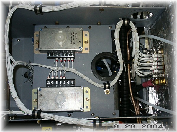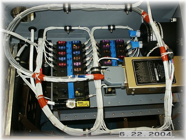 This is a picture of the center of the boot cowl area. This area actually has three shelves. The bottom shelf will contain the AHRS unit for the EFIS. The center shelf (shown) contain the alternator controllers for my two alternators. The top shelf contains the engine information computer (which drives the EFIS engine display) and the lighting heat sink. My ground bus wires also terminate in this area. You'll note that on the ground bus, I've numbered the connections. These will correspond with my wiring diagrams. This is a lesson I learned on my previous airplanes. If you are having a problem with one of your circuits, it is impossible to track down the ground point if you don't number things. Sometimes, the problem with a circuit may be an intermittent ground, as was the case on my RV-6 with the fuel gauge circuit. It took me forever to find it because I had to "ring out" all the ground connections. This time, I know exactly where each circuit terminates.